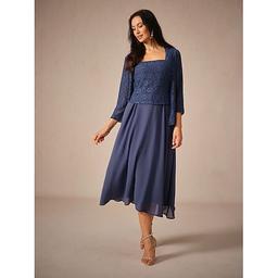 Dame Telængde A Linje Kjole Kjole med jakke Elegant Semi formelle kjoler Bryllupsgæst Regulær Helfarve 3/4-ærmer Firkantet hals Navyblå Sommer Forår Efterår