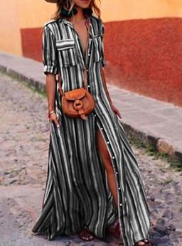kvinders skjortekjole boho smarte kjoler maxi lang kjole ferie strand bohemia skjorte krave knaplomme halværmet sommer forår løs pasform stribet