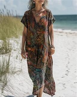 Damen Langes Kleid Maxikleid Baumwoll-Leinen-Kleider Freizeitkleid Boho-Kleid Westernkleid Mode Outdoor Party Ferien Normale Passform Blume Kurzarm V Ausschnitt Rosa Wein Blau Orange Sommer