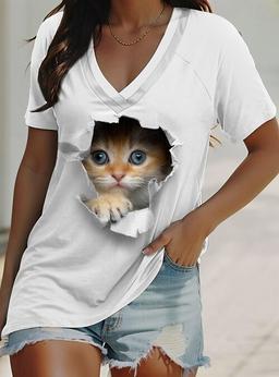 Damen T-Shirt V-Ausschnitt Langarm Grafik Casual Tier Katze Kurzarm Reguläre Tops Täglich Wochenende Süße Outfits Print Weiß Grün Sommer