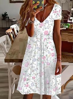 Damen Mini Kleid A-Linien Kleid T-Shirt Kleid Tee Kleid Sundress Urlaub Lässig Strand Urlaub Täglich Ausgehen Regelmäßige Passform Floral Grafik Kurzarm V-Ausschnitt Weiß Gelb Sommer