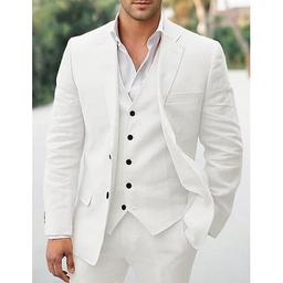 Herren Hochzeit Leinenanzüge Weiß Himmelblau Einfarbig Figurbetonter Schnitt 3-teilig Einreihige Zwei-Knopf-Jacke