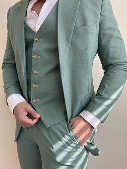 Herren Hochzeit Anzüge Fallendes Revers Salbei Formell Einfarbig Figurbetonter Schnitt 3-teilig Einreihige Zwei-Knopf-Jacke