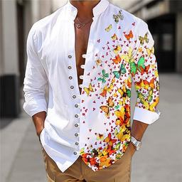 Herren Schmetterling Hemd Leinenhemd Langarm Lässig Alltagskleidung Ausgehen Wochenende Frühling Stehkragen Druck Button-Down Blau Purpur Orange