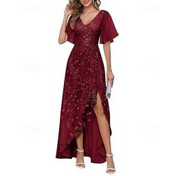 A-Linie Hochzeitsgast Kleider Hoch-Niedrig Kleid Hochzeitsgast Asymmetrisch Kurzarm V-Ausschnitt Herbst Hochzeitsgast Spitze mit Schlitz