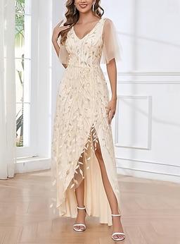 A-Linie Hochzeitsgast Kleider Hoch-Niedrig Kleid Hochzeitsgast Asymmetrisch Kurzarm V-Ausschnitt Herbst Hochzeitsgast Spitze mit Schlitz