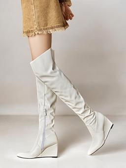 Schwarze Overknee-Stiefel mit Keilabsatz für Damen – elegantes Kunstleder, spitze Zehenpartie, Wintermode für die Freizeit oder zum Ausgehen