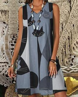 Damen Minikleid Freizeitkleid Blumenkleid Klassisch Modern Urlaub Täglich Ferien Normale Passform Katze Ärmellos V Ausschnitt Blau Khaki Grau Sommer