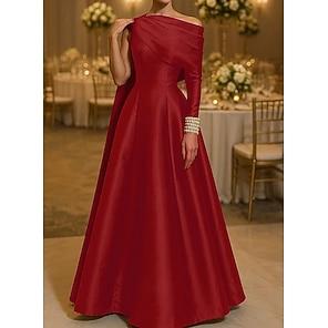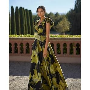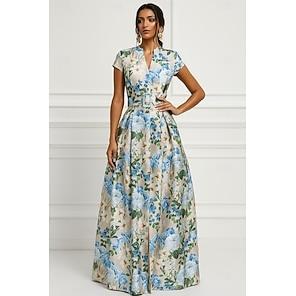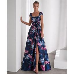 A-Linie Bodenlang Abendkleid Ballkleid Festliche Kleidung Elegant Hoher Schlitz Kurzarm Quadrathals Hochzeit Formell Tasche Satin mit Blumenmuster Schlitz Tasche
