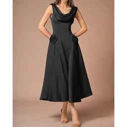 A-Linie Mutter der Braut Kleid Elegant Vintage Einfach Trichter-Ausschnitt Cowl Neck Tee Länge Satin Ärmellos mit Blume