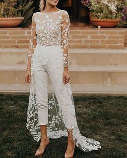 Strandhochzeit Saal Offenes Rücken Hochzeitskleider Hosenanzüge Scoop-Ausschnitt Lange Ärmel Sweep Brush Train Spitze Brautkleider Mit Blume 2025