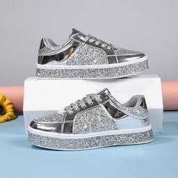 Damen Glitzer Plateau Sneaker – silberglänzende Freizeitschuhe zum Schnüren mit funkelnden Details für Party und Streetstyle