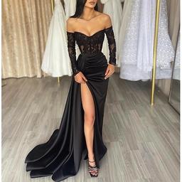Meerjungfrauenschnitt Bodenlang Abiballkleider Abendkleid Ballkleid Festliche Kleidung Durchsichtig Schwarz Hoher Schlitz Langarm Schulterfrei Formell Hochzeitsgast Herbsthochzeitsempfang Satin mit