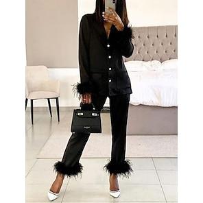 Women's Pajama Set Casual Comfort Pure Color Elastic Waist Feather Shirt Pant Home Daily Long Sleeve Shirt Collar Black White Pink Red Blue Summer Spring Fall Regular Fit