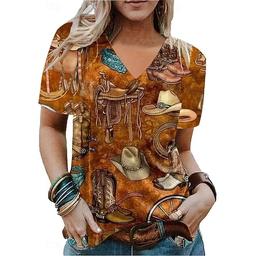Women's Summer Tops Graphic Tribal Fashion Western Casual Short Sleeve V Neck Regular Tops Daily Going out Weekend Patchwork Print Army Green Brown off-white Summer Spring
