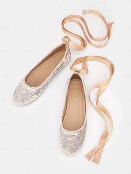Women's Ballet Flats with Floral Embroidery and Ribbon Laces, Elegant Lace-Up Design, Perfect for Brides and Formal Occasions