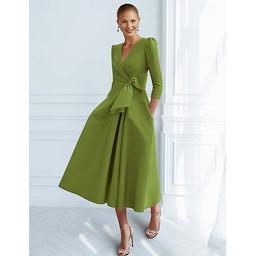 A-Line Cocktail Dresses Elegant Dress Formal Ankle Length 3/4 Length Sleeve V Neck Pocket with Bow(s) Ruched Dresses