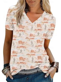 Women's Summer Tops Graphic Tribal Fashion Western Casual Short Sleeve V Neck Regular Tops Daily Going out Weekend Patchwork Print Ivory Beige Red White Summer Spring