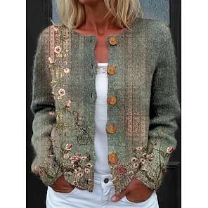 Women's Cardigan Sweater Knitted Ribbed Button Front Round Neck Long Sleeve Lightweight Daily Floral Crew Neck Buttons Print Regular Tops Knit Outdoor Weekend Red Green Spring Fall