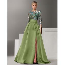 A-Line Floor Length Evening Gown Ball Gown Formal Dress Elegant Color Block High Split Half Sleeve Shirt Collar Wedding Formal Satin with Bow(s) Slit Embroidery