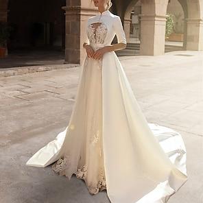A-Line Floor Length Evening Gown Elegant Color Block High Split Half Sleeve Shirt Collar Wedding Formal Satin with Slit Embroidery Appliques