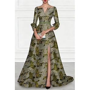 Floral Jacquard Brocede A-Line Evening Gown Elegant Formal Dress Formal Wedding Floor Length 3/4 Length Sleeve V Neck Nylon with Bow(s) Slit