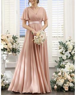 A-Line Bridesmaid Dress V Neck Short Sleeve Elegant Floor Length Chiffon with Ruching 2022