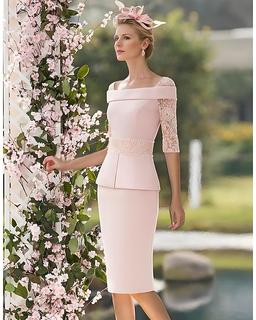 Dress Mother of the Bride Dress Formal Wedding Guest Elegant Vintage Jewel Neck Tea Length Stretch Fabric 3/4 Length Sleeve with Lace Pearls Race Day Dress