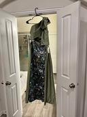 I’m in love with this dress! The green satin looks so elegant, and the one-shoulder style is super flattering.