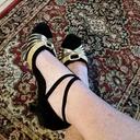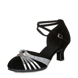 Women's Latin Dance Shoes – Black Suede Ballroom Heels with Gold Straps, Ankle Strap, and Suede Sole for Salsa, Tango, and Performance