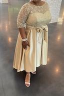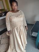 I wore this dress to my stepsons wedding and received numerous compliments! Good quality on the dress material and elegant details on the lace bodice. I loved the champagne color, which looked amazing on my beautiful cinnamon almond complexion! This dress fits very flattering on my voluptuous figure as well. :