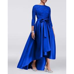 A-Line Asymmetrical Party Dress Cocktail Dress Wedding Guest Dress 3/4 Length Sleeve Jewel Neck Elegant Plus Size High Low Wedding Guest Satin Lace Mother of the Bride Dress with Sash / Ribbon