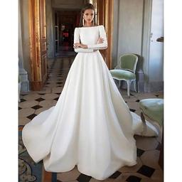 Beach Wedding Formal Wedding Dresses Ball Gown Scoop Neck Long Sleeve Court Train Satin Bridal Gowns With Buttons Pleats
