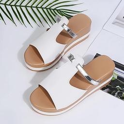 Women's Minimalist White Platform Sandals with Metallic Strap - Casual Summer Open-Toe Wedge Shoes