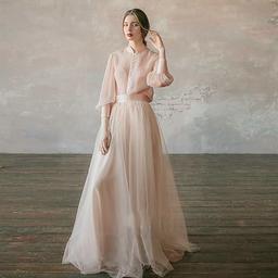 Two Piece Floor Length Prom Dresses Empire Minimalist Tiered Plisse Long Sleeve Stand Collar Wedding Guest Formal Evening Chiffon with Buttons Tiered