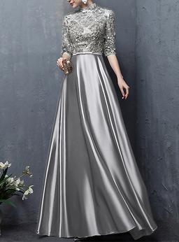 A-Line Floor Length Wedding Guest Dress Formal Dresses Evening Gown Half Sleeve High Neck Elegant Vintage Wedding Guest Satin Mother of the Bride Dress with Bow(s) Appliques