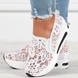 Women's Beige Lace Mesh Slip-On Platform Sneakers with Air Cushion Sole - Stylish and Comfortable Casual Shoes for Daily Wear