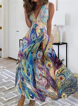 Women's Maxi Dress A Line Dress Casual Dress Tank Dress Floral Peacock Print V Neck Casual Daily Date Sleeveless Summer Spring