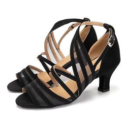 Women's Black Strappy Latin Dance Shoes with Mesh Panels and Suede Sole, Open Toe Ballroom Heels for Salsa, Tango, and Performance Practice