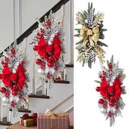 Christmas Swags Christmas Wreaths for Front Door, Prelit Xmas Stairway Swag Christmas Decorations, Artificial Winter Garland with Bow, Balls, Stair Railing Wall Window Xmas Decor