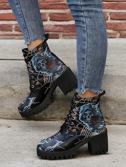 Women's Halloween Skull Print Combat Boots – Chunky Heel, Lace-Up Design, Perfect for Spooky Season & Festive Outfits