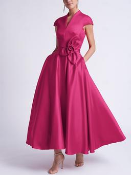 A-Line Tea Length Cocktail Dresses Party Dresses Wedding Guest Dresses Elegant Sleeveless V Neck Cocktail Party Pocket Satin with Bow(s)