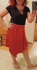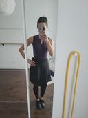 Erinomainen hame harjoitteluun. Se on lyhyempi kuin luulin, että olen varma, 5 jalkaa 3 161 cm. Se on monipuolinen hame, joka sopii hyvin minkä tahansa topin kanssa. täydellinen latinalaistanssiharjoitteluun tai illanviettoon. Kangas on spandexia, joten ei tyylikäs viimeistely, mutta erittäin mukava liikkua.