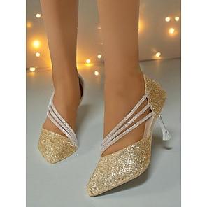Uniquement sur l'applicationEscarpins à bout pointu et paillettes dorées pour femmes - élégants escarpins à talons hauts et à lanières pour événements formels et soirées