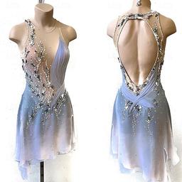 Uniquement sur l'applicationRobe de patinage artistique Femmes Fille Patinage Robe Bleu Ciel Dos Nu Maille Spandex Haute Élasticité Entraînement Compétition Tenue de Patinage Classique cristal pailleté manche longue Patinage