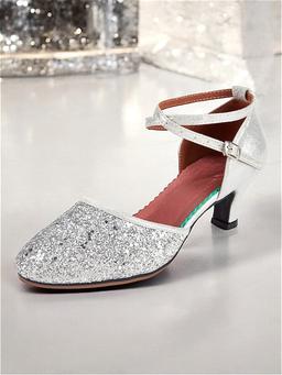 scarpe da ballo latino da donna con glitter argento e cinturino alla caviglia, ideali per spettacoli da sala