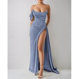 Abito da sera A-Line elegante abito formale lunghezza sul pavimento senza maniche senza spalline tasche paillettes con glitter arricciato