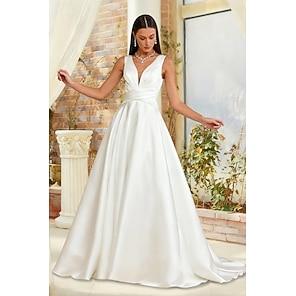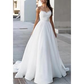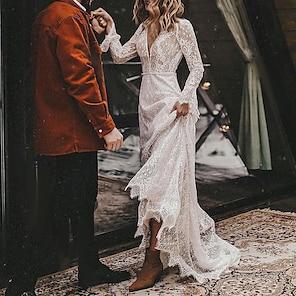 Matrimonio in spiaggia Abiti boho da matrimonio con schiena aperta Abiti da sposa in linea A scollatura a gola maniche lunghe strascico/strascico in pizzo con pieghe applicazioni