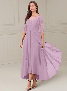 Paarse A-Lijn Formele Moeder van de Bruid Jurk Bruiloft Gast Elegante Juweel Hals Vloer Lengte Chiffon 3/4 Lengte Mouw Wrap Inclusief met Cascading Volants Effen Kleur