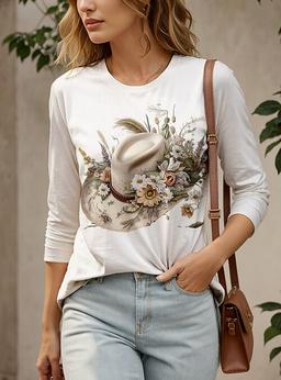 Kentucky-derby Dames Blouse Bloemig Grafisch Casual Lange mouw Strakke ronde hals Normale tops Dagelijks Uitgaan Afdrukken Wit Zomer Lente